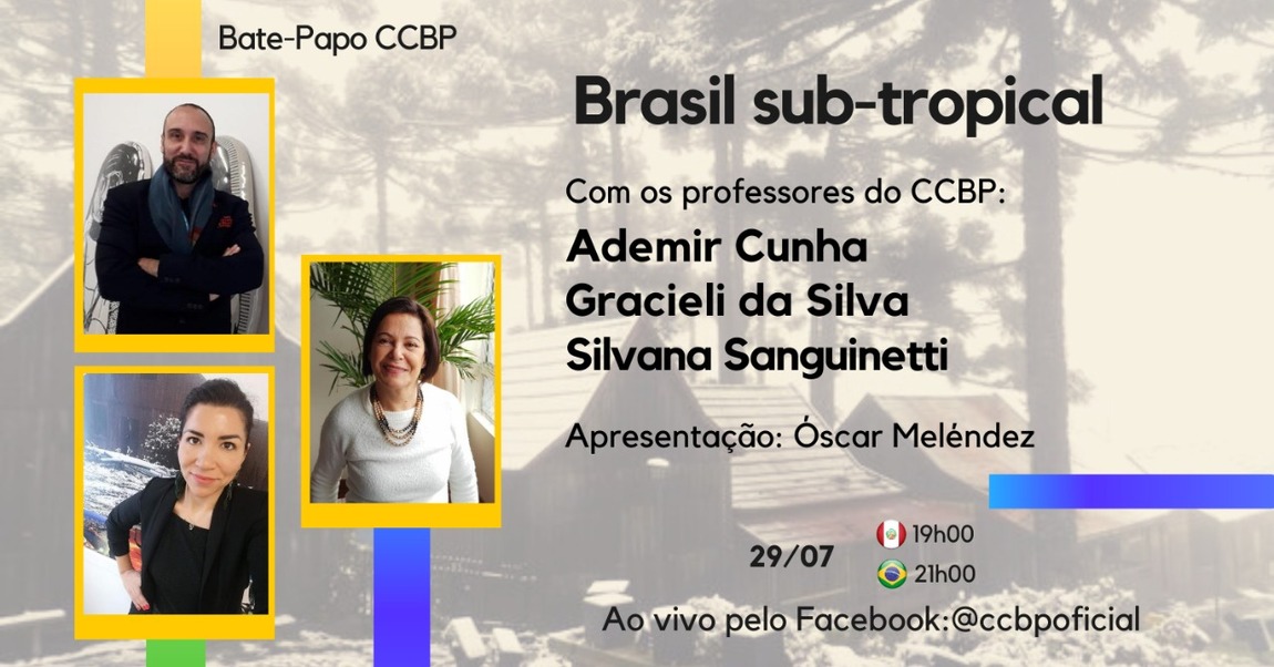 #BATE-PAPO CCBP apresenta "Brasil sub-tropical", com os professores do CCBP: Ademir Cunha, Gracieli da Silva, e Silvana Sanguinetti. Apresentação do Prof. Óscar Meléndez.