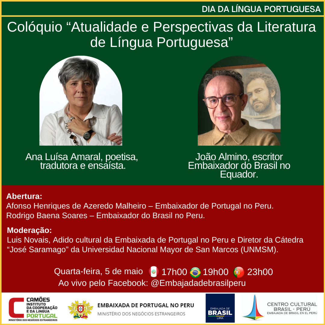 No Dia Mundial da Língua Portuguesa e da Cultura, as Embaixadas de Portugal e do Brasil, com o apoio do Instituto Camões e do Centro Cultural Brasil-Peru, realizam o Colóquio “Atualidade e Perspectivas da Literatura de Língua Portuguesa”, com a participação de Ana Luísa Amaral, poetisa, tradutora e ensaísta, e João Almino, escritor e Embaixador do Brasil no Equador. A abertura será realizada por Afonso Henriques de Azeredo Malheiro, Embaixador de Portugal no Peru, e Rodrigo Baena Soares, Embaixador do Brasil no Peru. O evento será moderado por Luís Novais, adido cultural da Embaixada de Portugal no Peru e Diretor da Cátedra José Saramago da Universidad Nacional Mayor de San Marcos (Peru).