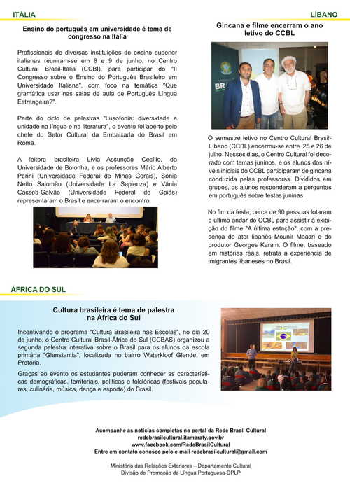 Centro Cultural Brasil-Perú Embajada de Brasil en el Perú Calle General Borgoño, 1156 - Miraflores • Lima • 2410654 Lunes a Jueves: 7.30 a.m. a 8:30 p.m.